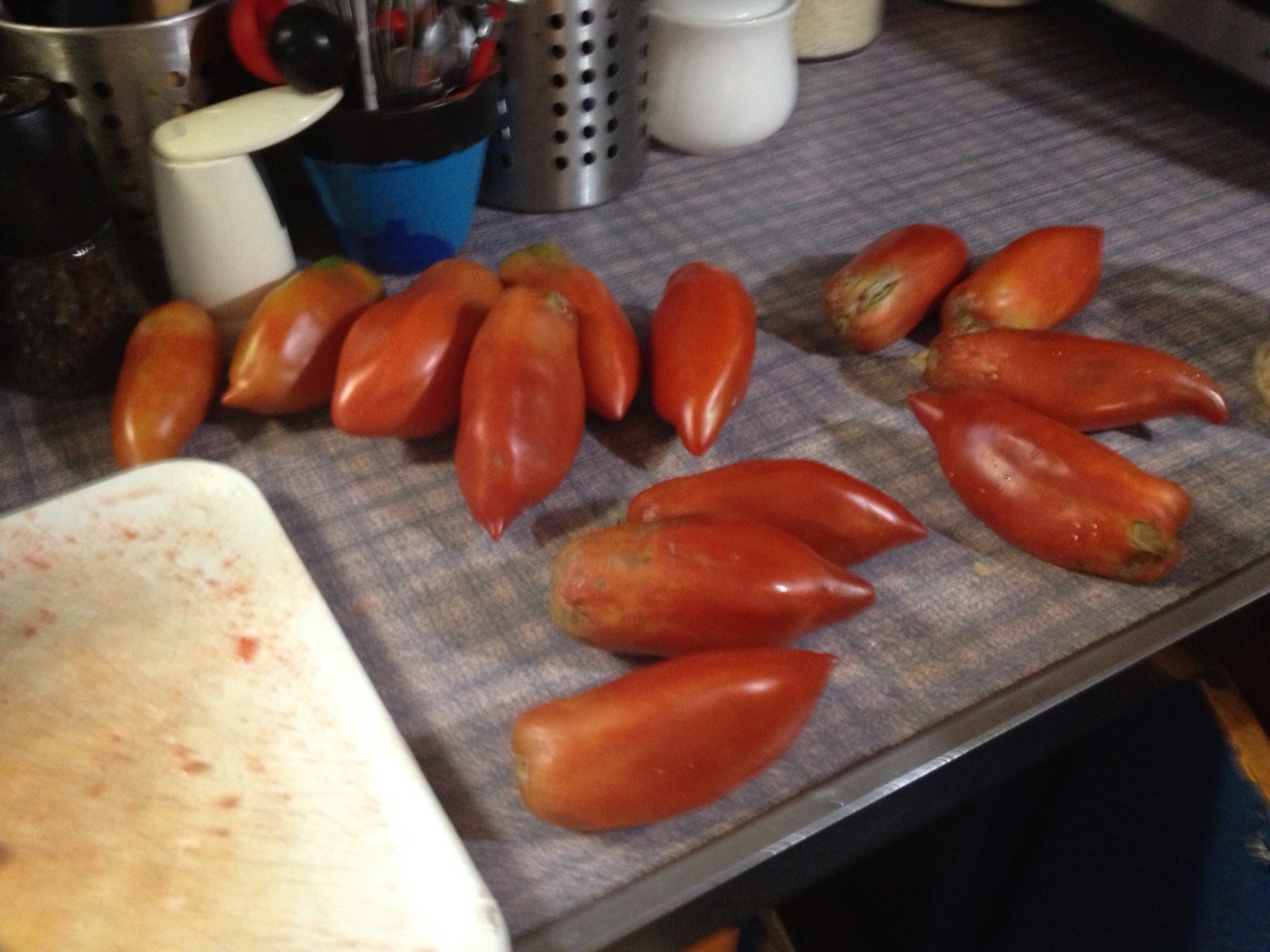 Last night’s dinner may have been about the end for our own tomatoes. We used about a dozen San Marzano Gigante’s to make a sauce into which we threw some clams, mussels, and scallops. A terrific Friday night fish stew. But today The Principessa did me a solid and took the walk of shame at the Montclair Farmers Market to purchase a few slicers as the garden is about done with tomatoes.